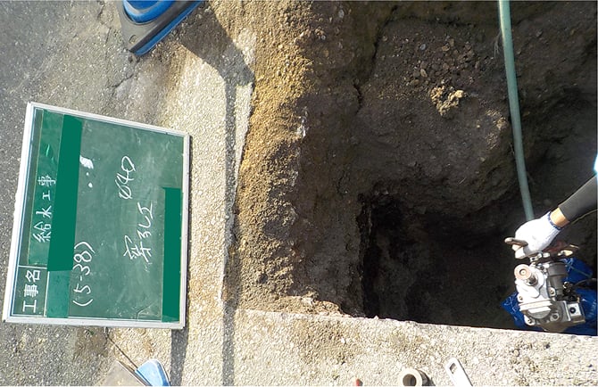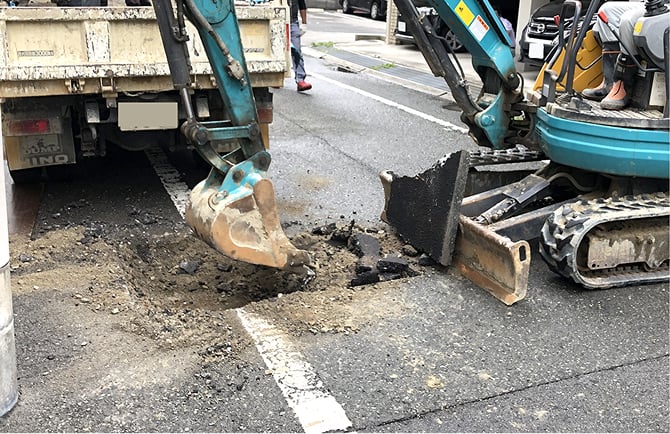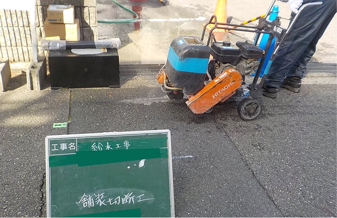 掘削する箇所にダイヤモンドカッターで切り込みを入れアスファルトを解体して配水管が見えるまで掘削します。