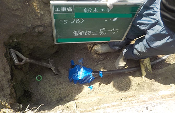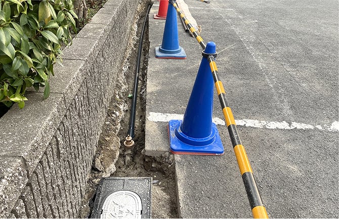 分水栓から新設した給水管を敷地内に布設後、止水栓、メーターボックス、水道メーターなどを新設します。