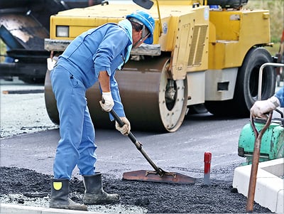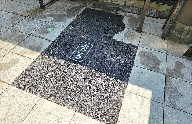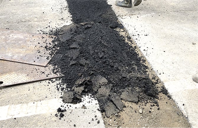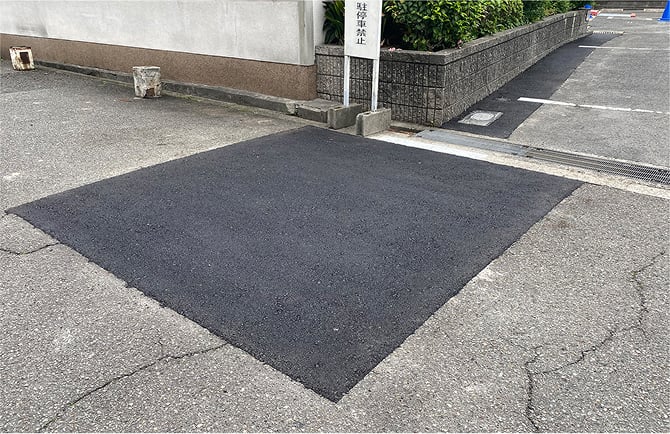 埋め戻しが終了すると、アスファルト舗装補修材で解体箇所を仮復旧します。
