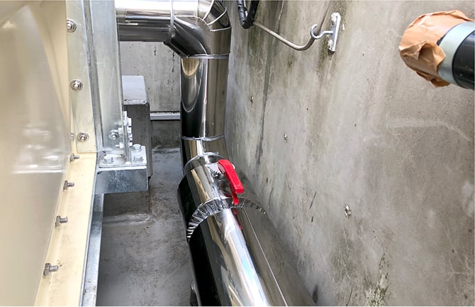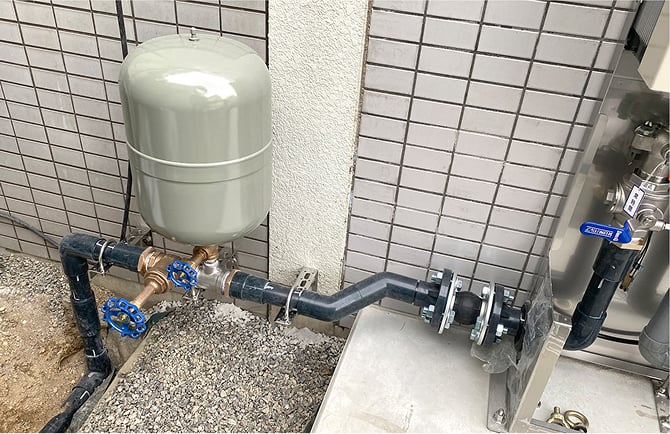 増圧ポンプ設置後は事前に道路から新設した給水管と、屋上へあがる揚水管を増圧ポンプに接続します。