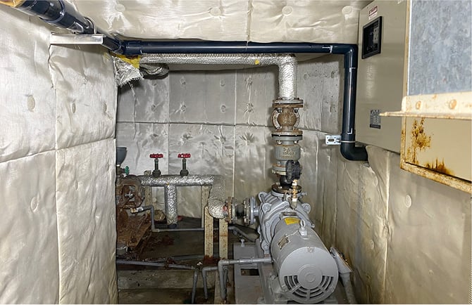 増圧ポンプから屋上の高架水槽までの揚水管を新設後、揚水管にも給水管同様耐圧試験を行います。配管に問題がなければ保温工事を行います。