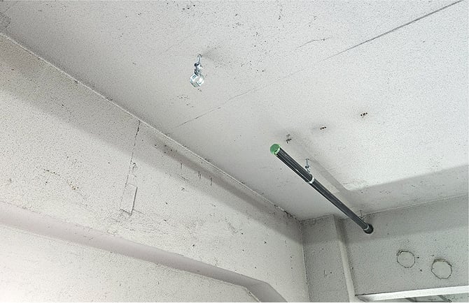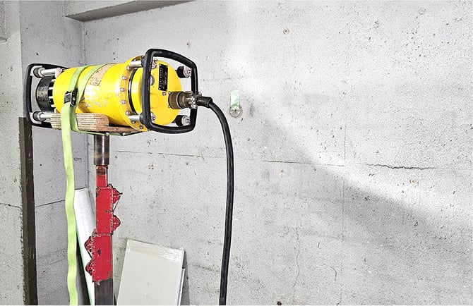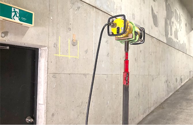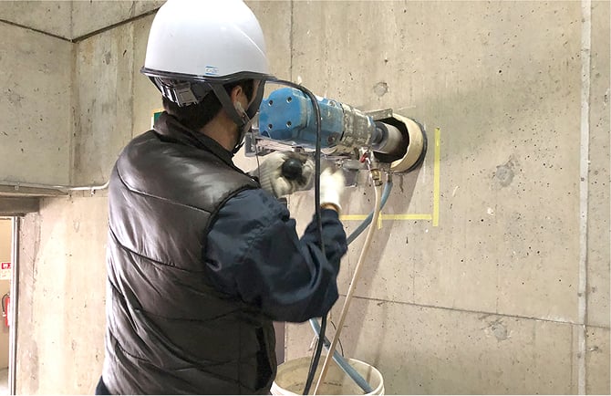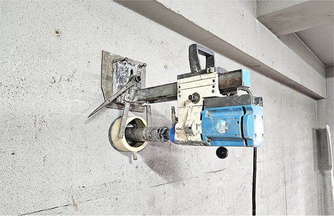 非破壊検査後にダイヤモンドコア(コアドリル工法)で壁を貫通して給水管を新設する準備をします。