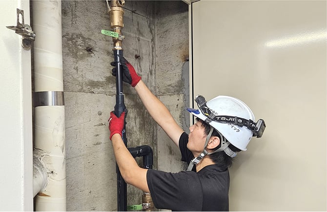 最上階まで揚水管を新設します。揚水管の末端には施工基準通り吸排気弁を設置します。