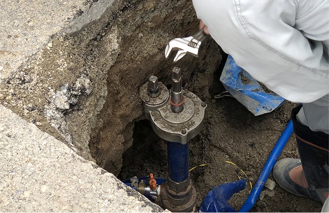 配水管から新しい給水管(50mm)を分岐するためにサドル付分水栓を取付けます。