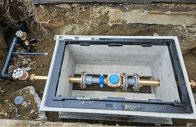 外部工事で取り出した給水管が、敷地内部に入ると新しい水道メーターとメーターボックス、止水栓を設置します。