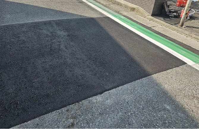 その後道路管理者と面積立会を行い本復旧する面積が決定すると、仮復旧した舗装を解体して、アスファルトで舗装を仕上げます。(画像は本復旧後です)
