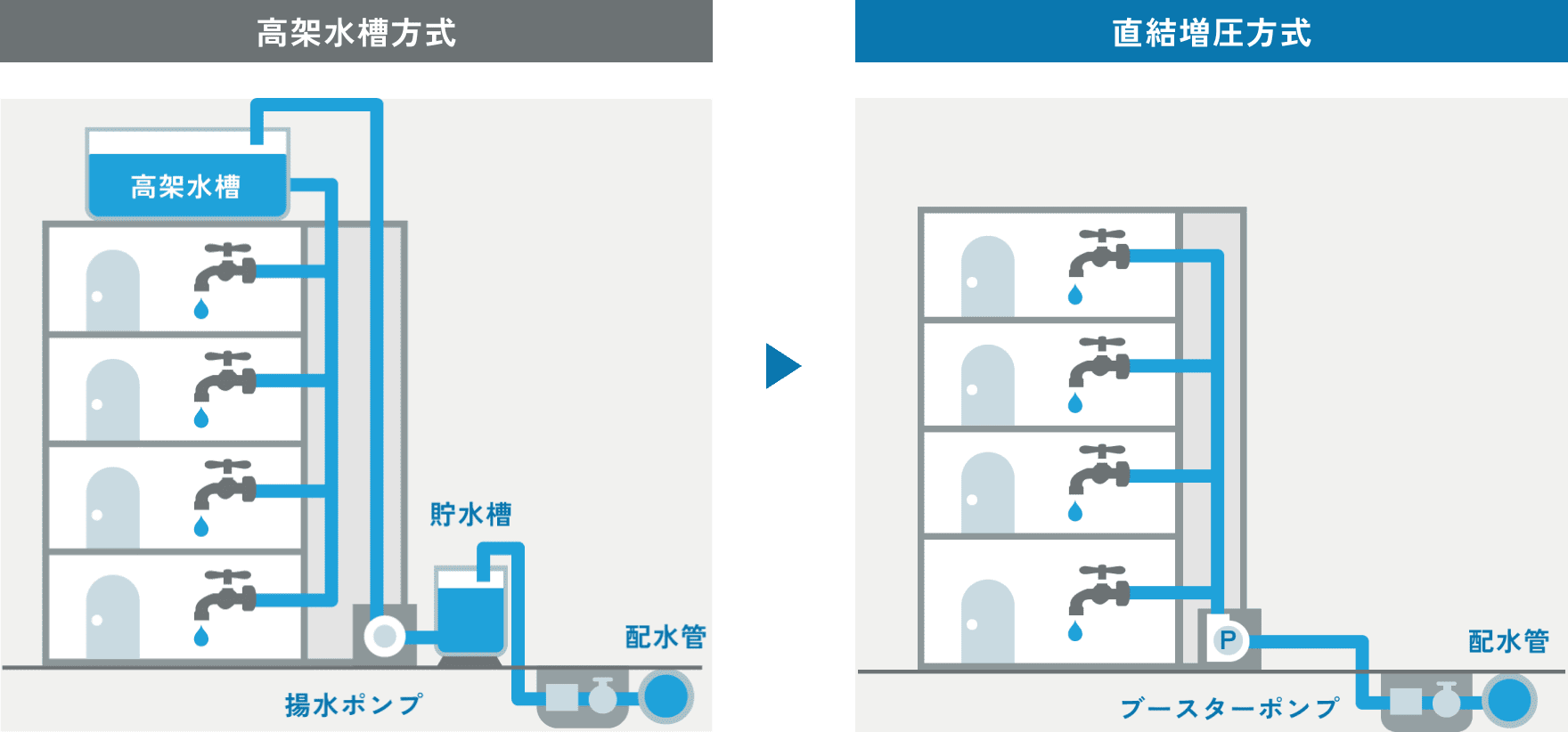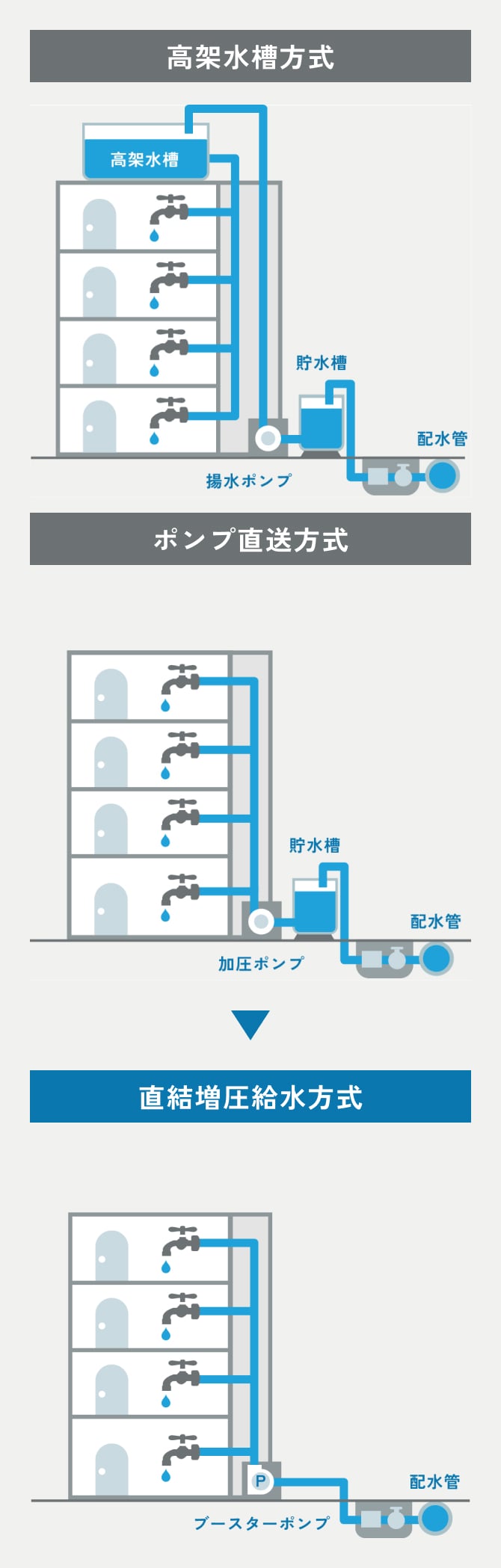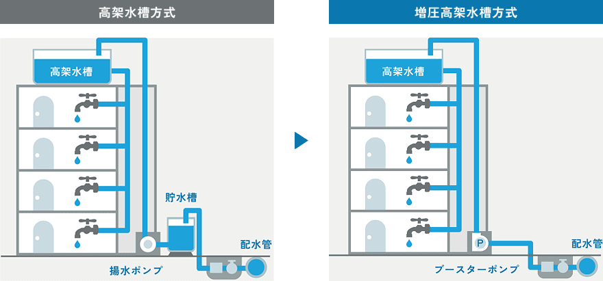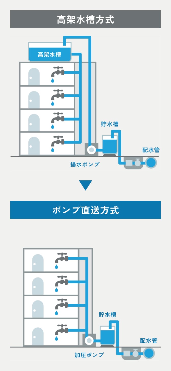 この方式は貯水槽で貯水せず、ブースタポンプで屋上の高架水槽へ揚水し高架水槽に貯水した水を自然流下で各家庭の蛇口まで水を供給します。