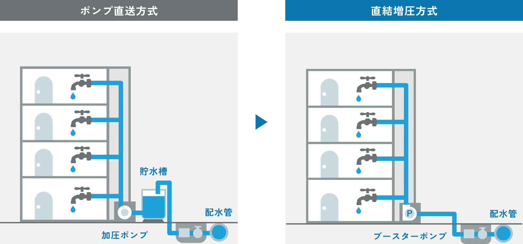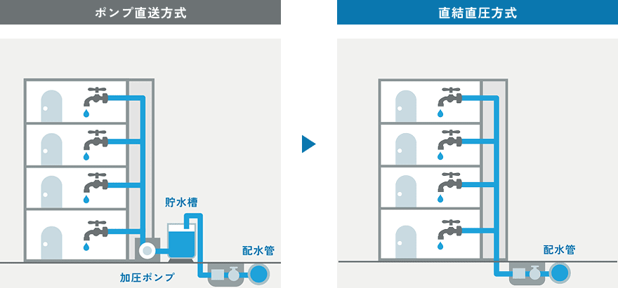 加圧ポンプと貯水槽を使ったポンプ直送方式から、ポンプや水槽を全く使用せずに配水管の圧力で各家庭の蛇口まで給水する方式に変更する工事です。